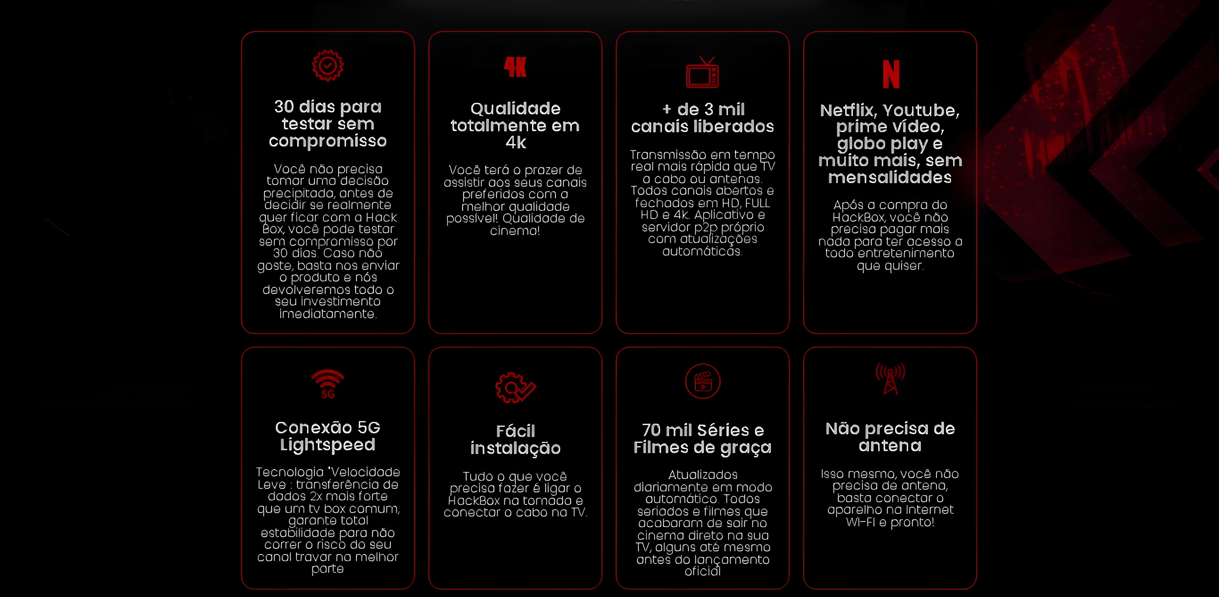 Você terá acesso a Youtube, Netflix, GloboPlay, Disney plus, 5g, +3 mil canais liberados desde esportes, novelas, reality shows além de contar com mais de 100 mil de séries e filmes - Tudo isso sem precisar comprar uma Smart TV e sem pagar mensalidades.